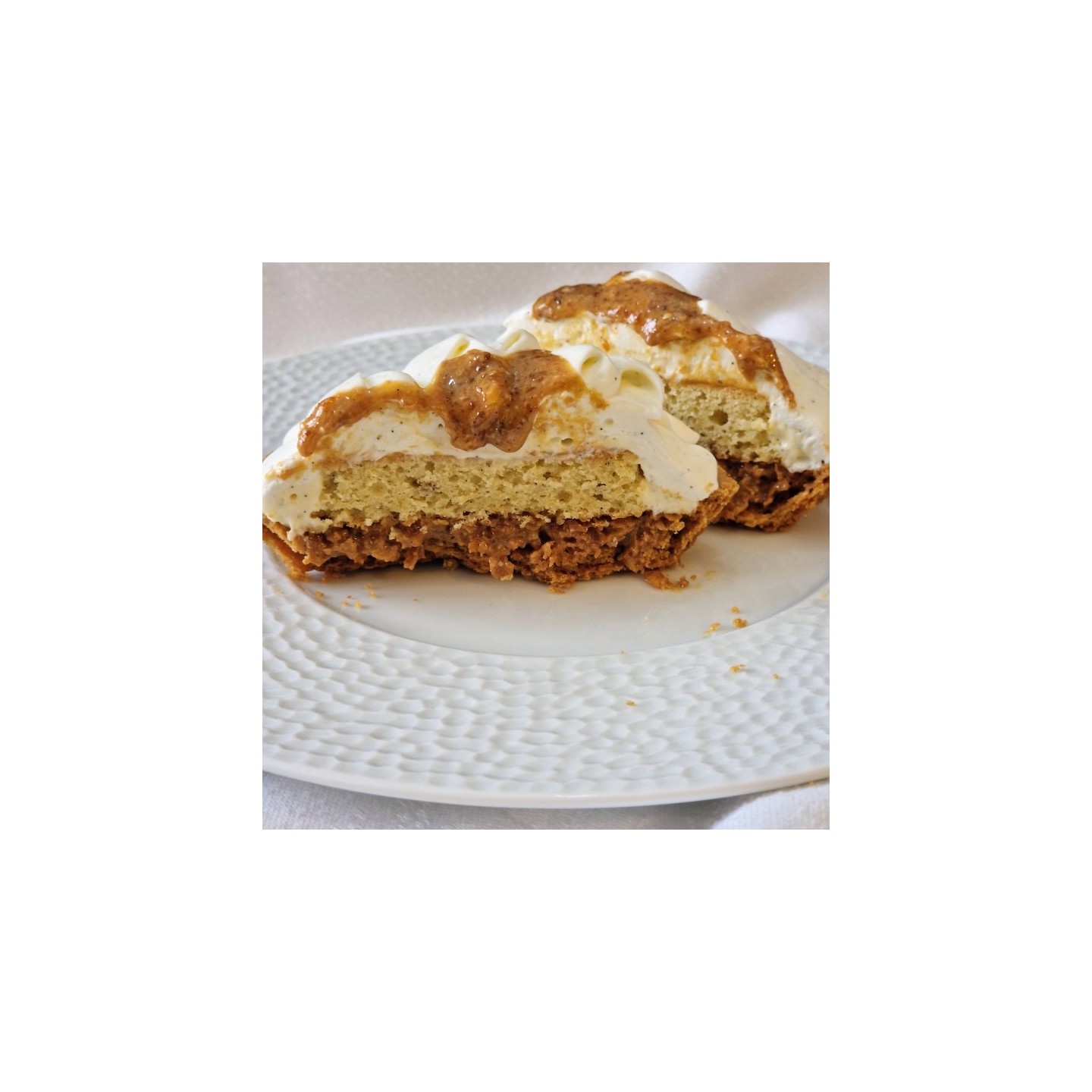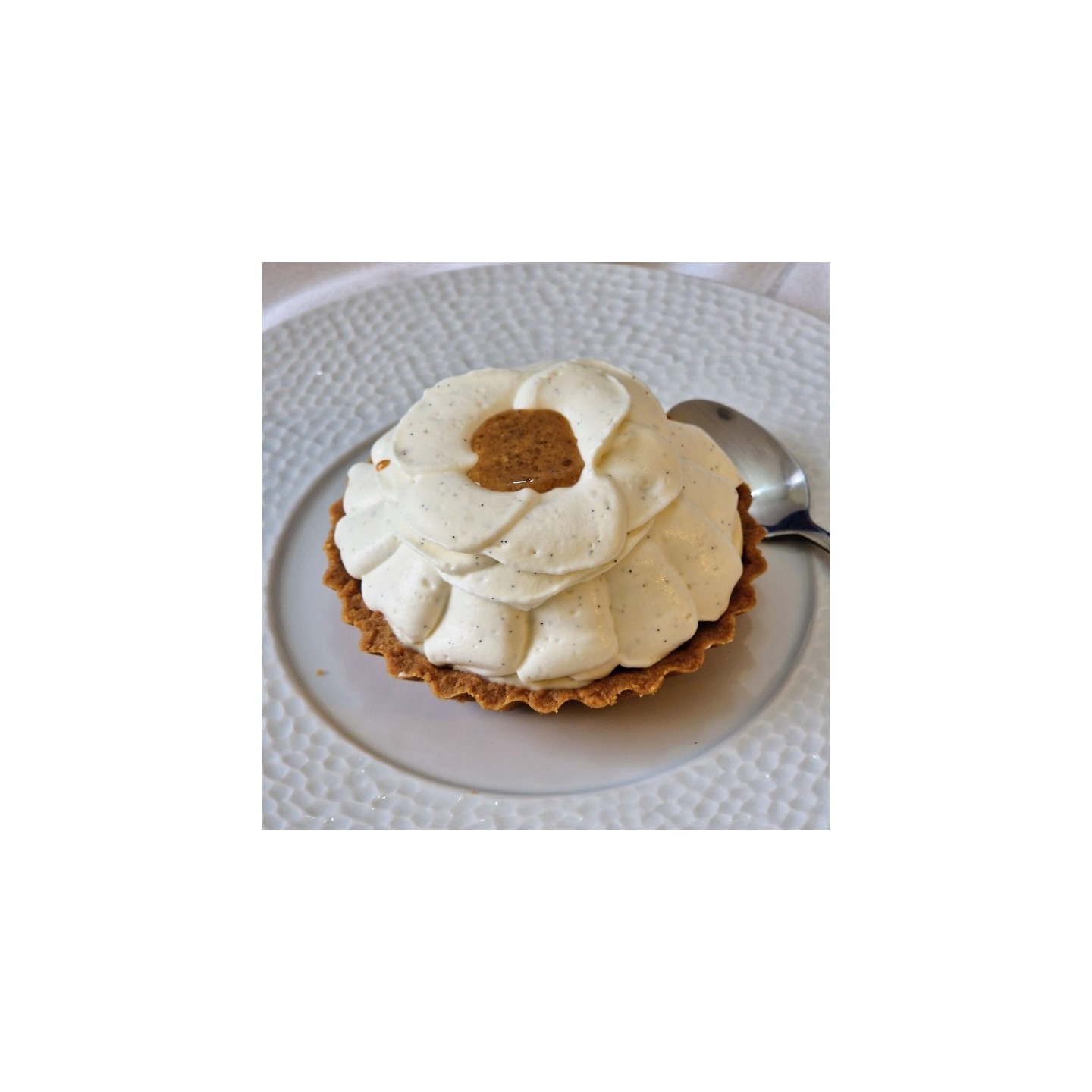 Ce gâteau se compose d'une pate sucrée à la farine de blé et d'Epeautre Bio , d'un praliné amandes à la vanille Bio, d'un crémeux à la vanille Bio, d'un biscuit amandes Bio et d'une ganache montée à la vanille Bio de Madagascar