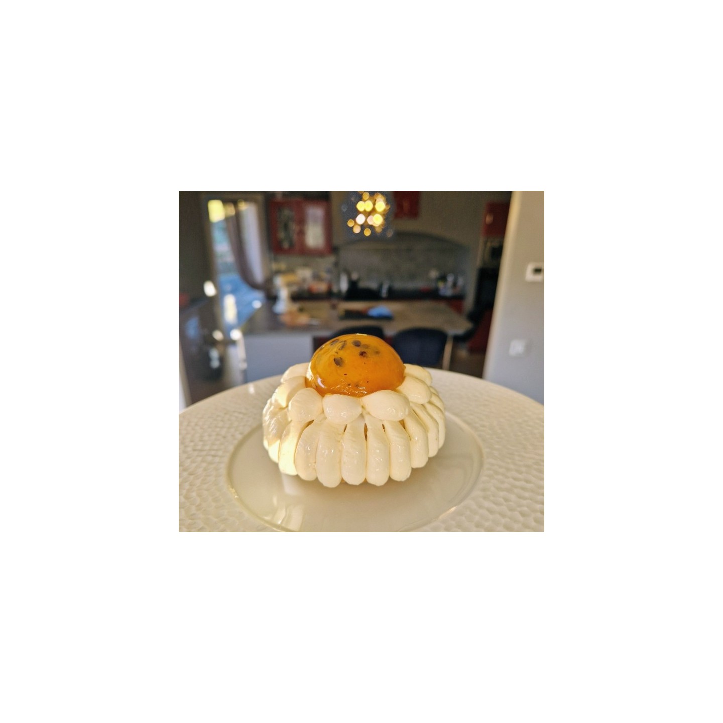 Ce gâteau se compose d’un biscuit croustillant amande au chocolat Dulcey, d'une ganache montée à la vanille , d'un crémeux à la vanille Bio de Madagascar puis au centre un crémeux aux fruits de la passion.
