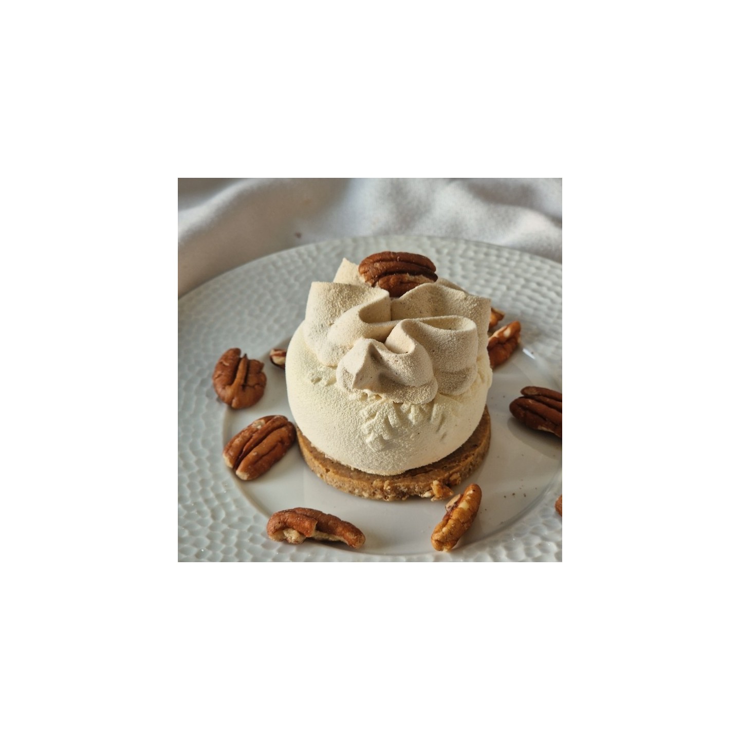 Ce gâteau est composé d'une mousse légère à la vanille Bio de Madagascar, d'un praliné noix de pécan, d'un biscuit amande à la vanille Bio, le tout déposé sur un biscuit croustillant streusel noix de pécan.