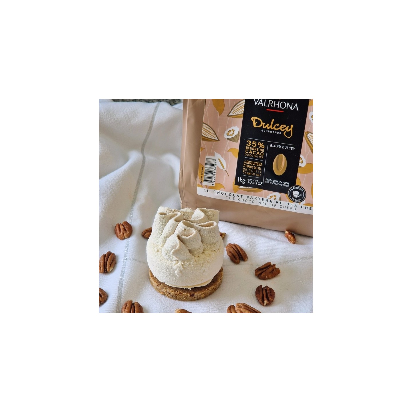 Ce gâteau est composé d'une mousse légère à la vanille Bio de Madagascar, d'un praliné noix de pécan, d'un biscuit amande à la vanille Bio, le tout déposé sur un biscuit croustillant streusel à la noix de pécan et au chocolat Dulcey Varhona.