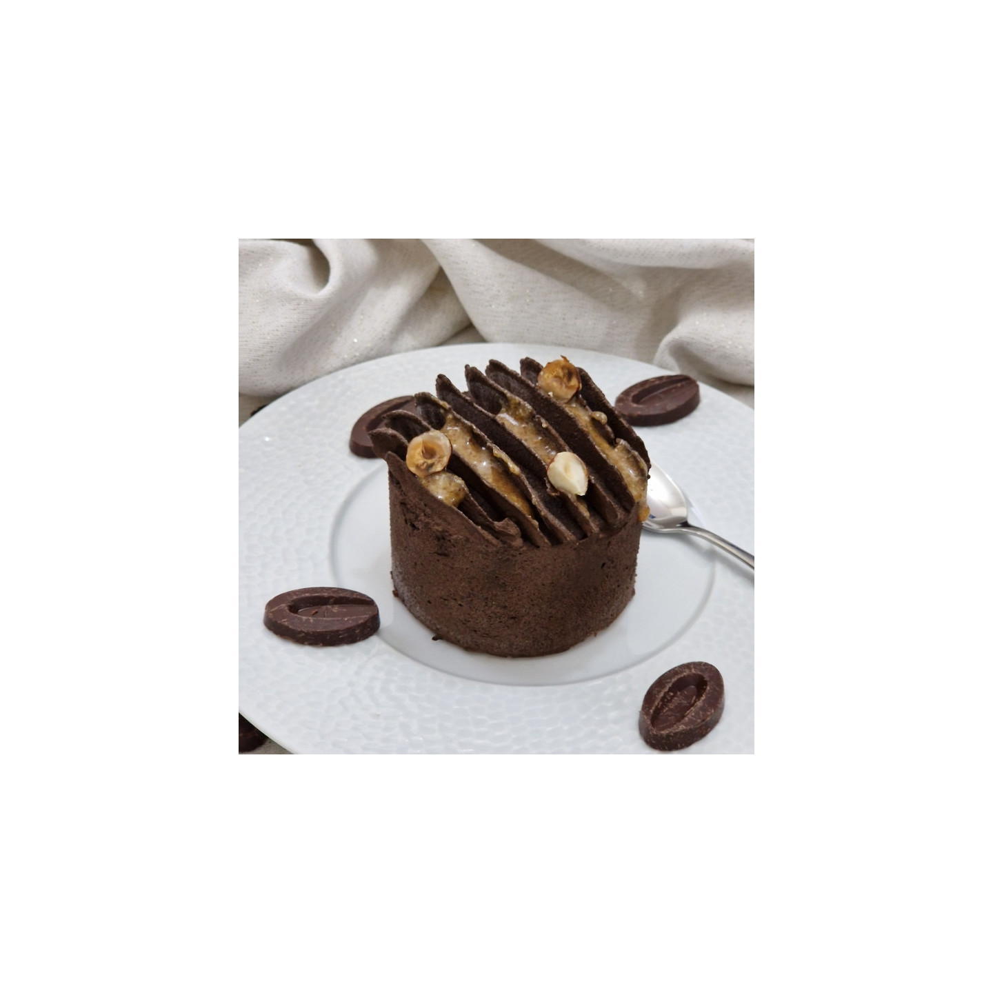 Ce gâteau se compose d’un biscuit croustillant à la noisettes , d'une mousse au chocolat Caraïbes de Valrhona , d’un crémeux chocolat noir et gianduja noisettes enrobé d'un caramel au beurre salé.