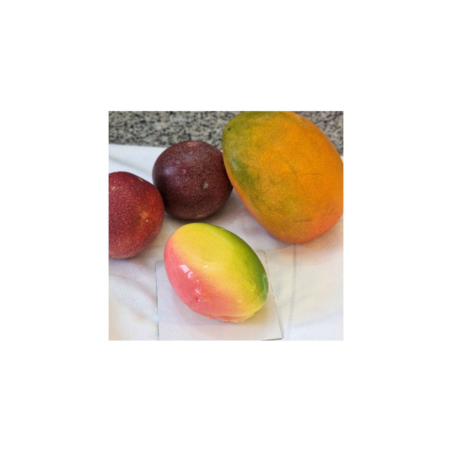 Ce gâteau est composé d'une mousse légère à la vanille Bio de Madagascar, d'un confit à la mangue et passion avec des morceaux de mangue fraîche et d'un biscuit amande.