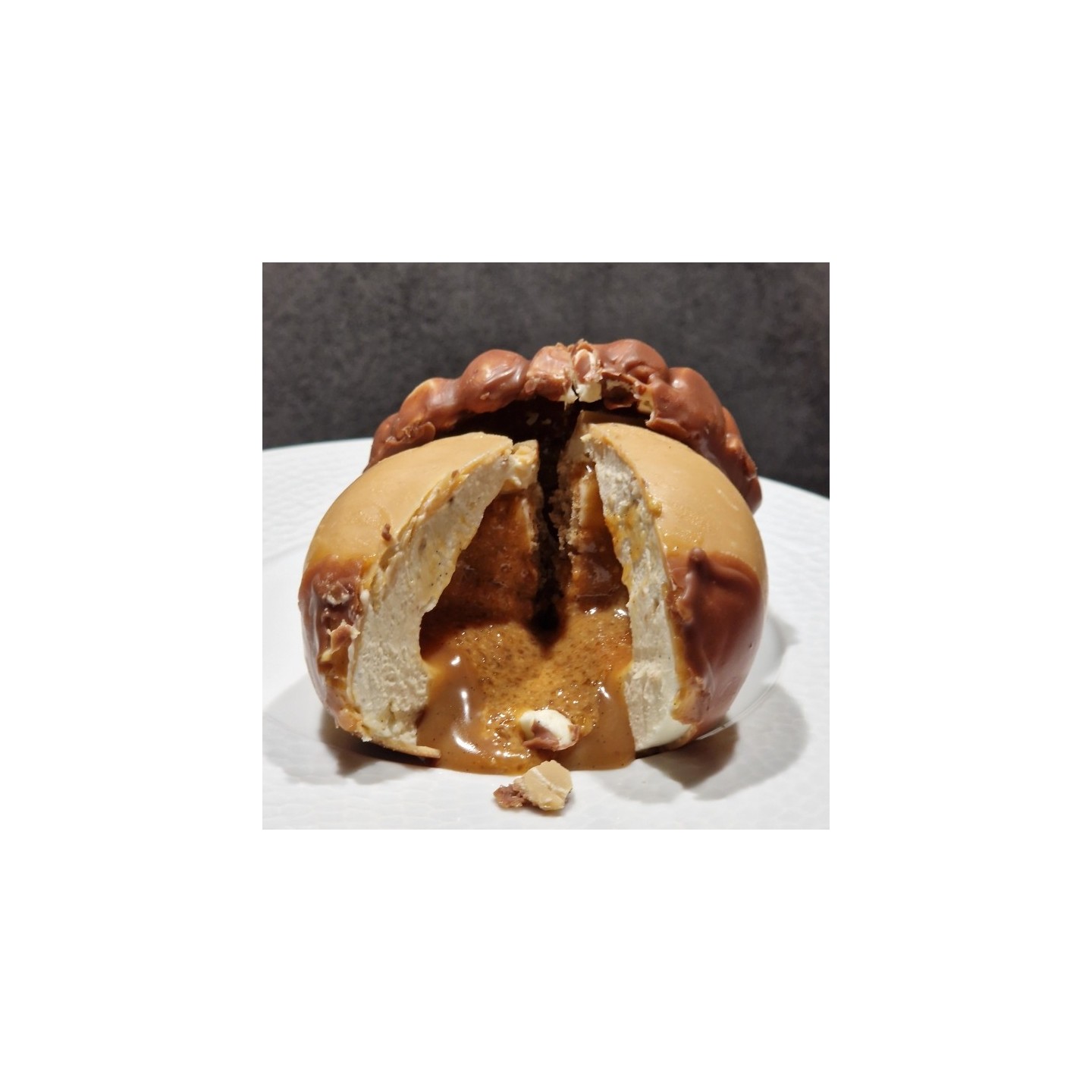 Ce gâteau est composé d'une ganache montée à la noisette et au chocolat Dulcey de Valrhona, d'un cœur coulant praliné noisettes et d'un caramel au beurre salé , puis d'un biscuit noisettes.