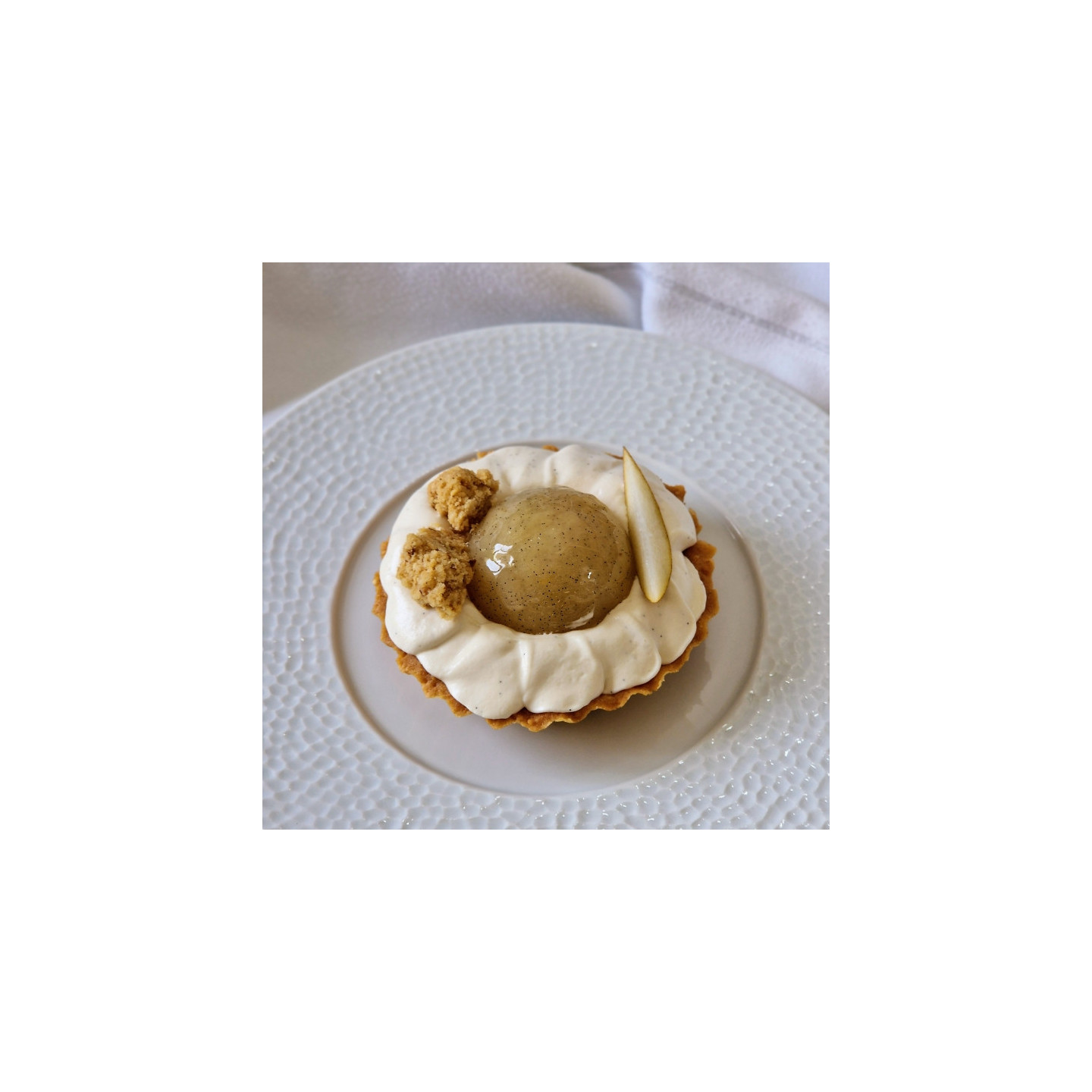 Ce gâteau se compose d’une pâte sucrée à la farine de blé et à la farine d'Epeautre Bio, d'une crème de noisettes avec des morceaux de poires cuites et d'une ganache montée à la vanille Bio de Madagascar.